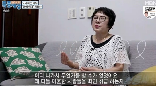 이어서 김정하는 "이혼 후 방송 섭외 오는 게 없었다. 그리고 방송이고 제가 생활할 수 있는 모든 게 멈췄다"며